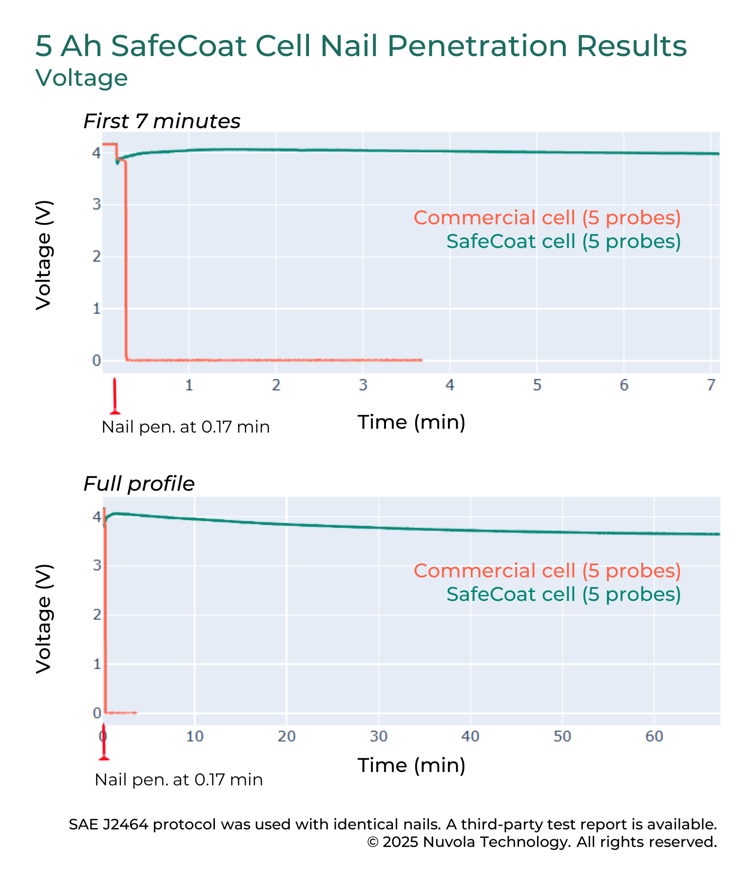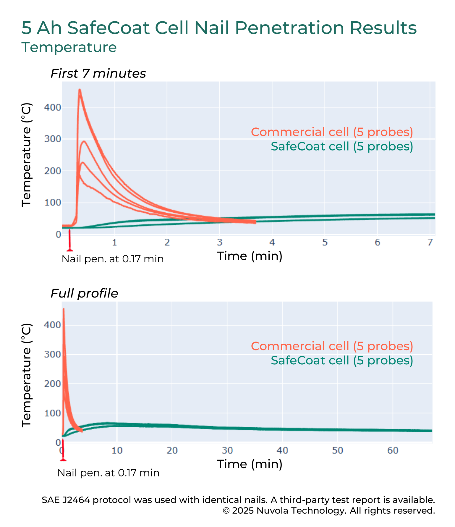 Nail penetration testing was performed in an accelerated rate calorimeter using the SAE J2464 protocol. Identical nails were driven into both a SafeCoat-applied 5 Ah (41-layer) cell and a benchmark 5 Ah cell with a thermally-enhanced ceramic-coated PE separator, each using standard flammable carbonate electrolytes.